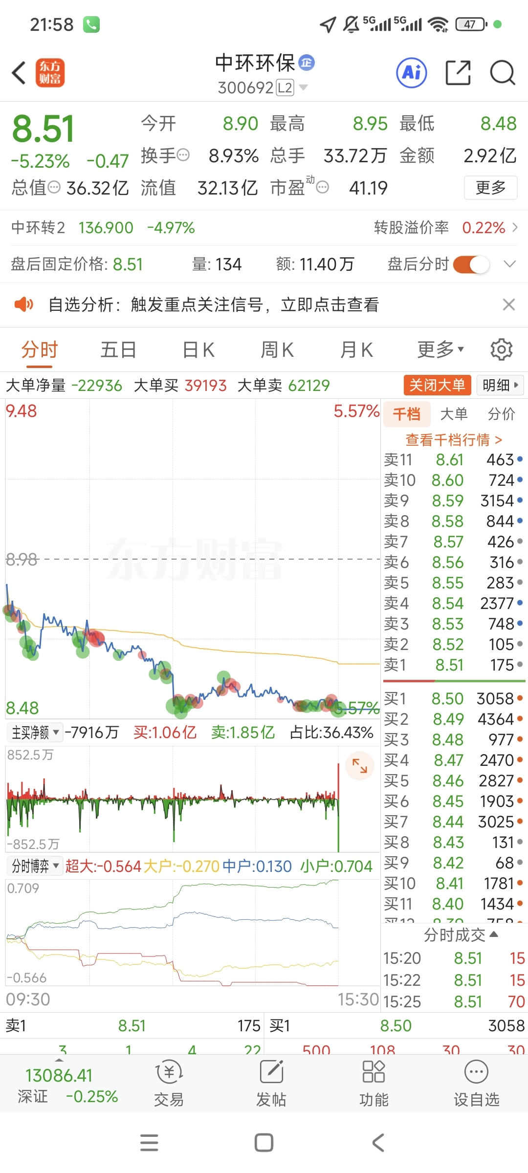 $中环环保(SZ300692)$ 上午看着在8.68元有不断的抵抗,对打。中午没打过,一下就到8.50元了,下午尝试反击,只能横盘。尾盘还被3000手大单砸盘。因为涨停后三连跌关注的中环,这两天股指期货交割日,就是要砸盘。看看明天有没有反攻