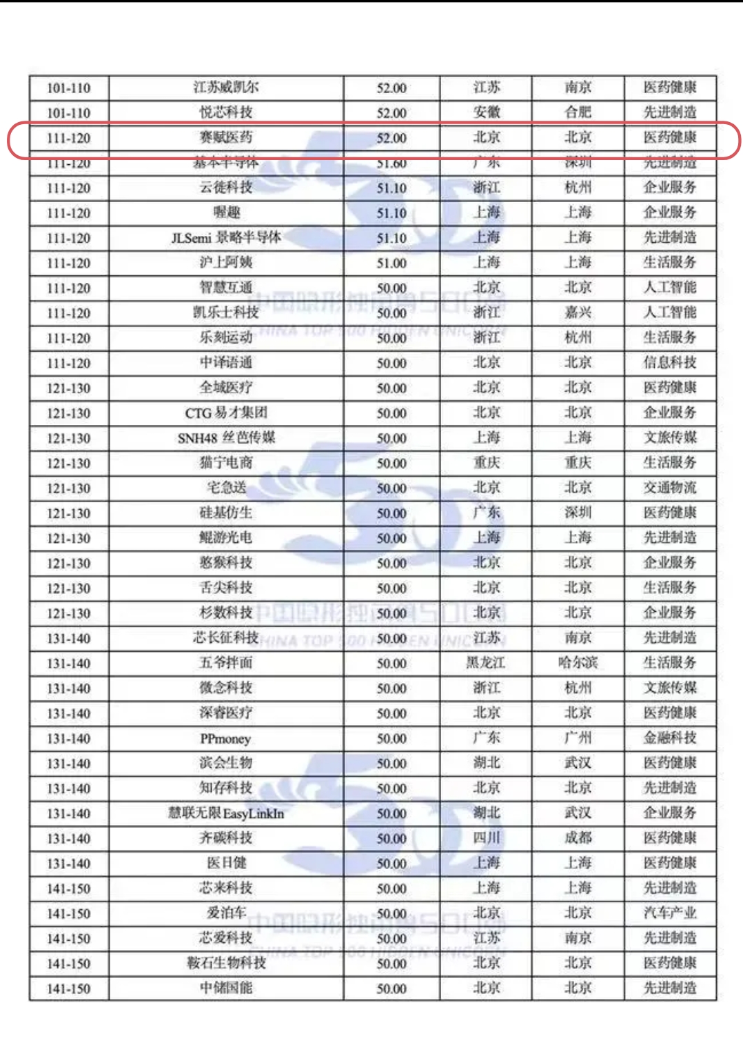 赛赋医药登榜,2025UP中国隐形独角兽,荣膺111强。估值52亿。这是专业机构