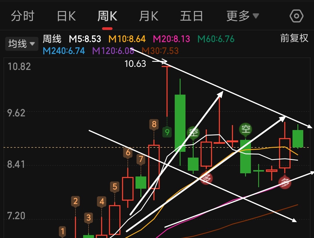 周线下跌通道,不是很乐观,5周线的上升波段走到上轨开始下跌,然后破5周线回踩10