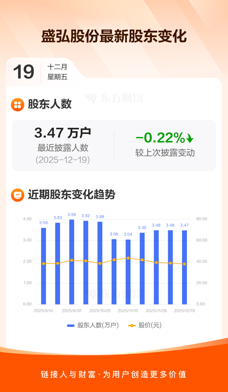 盛弘股份最新披露数据显示,截至12月19日公司股东户数为3.47万户,较上期(2025年12月10日)减少77户,降幅为0.22%。户均持有流通股数量由上期的7735股上升至7752股,户均持股金额由上期的29.95万元减少至29.37万元。
