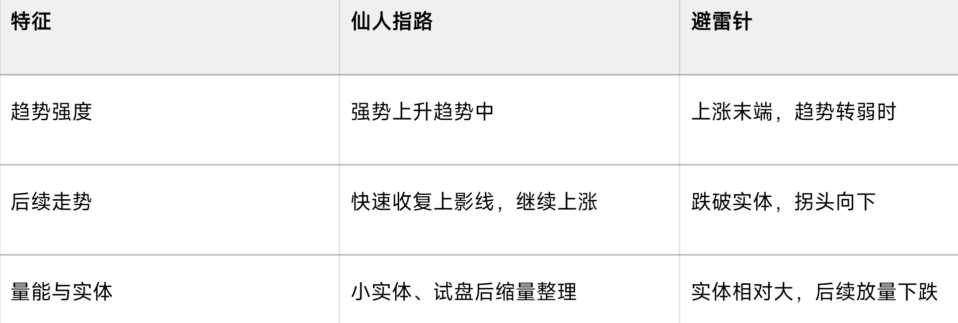 有些交易者会把看跌的“避雷针”(倒锤头线的看跌版)误判为“仙人指路”,最终被套。两者核心区别在于: