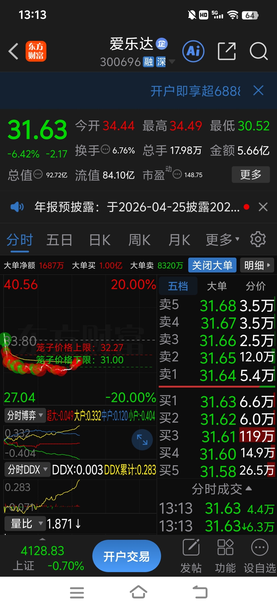 《只要敢冲32.08元》则全仓买入。牢记,爱乐达今天假开盘40.35元。停留很久
