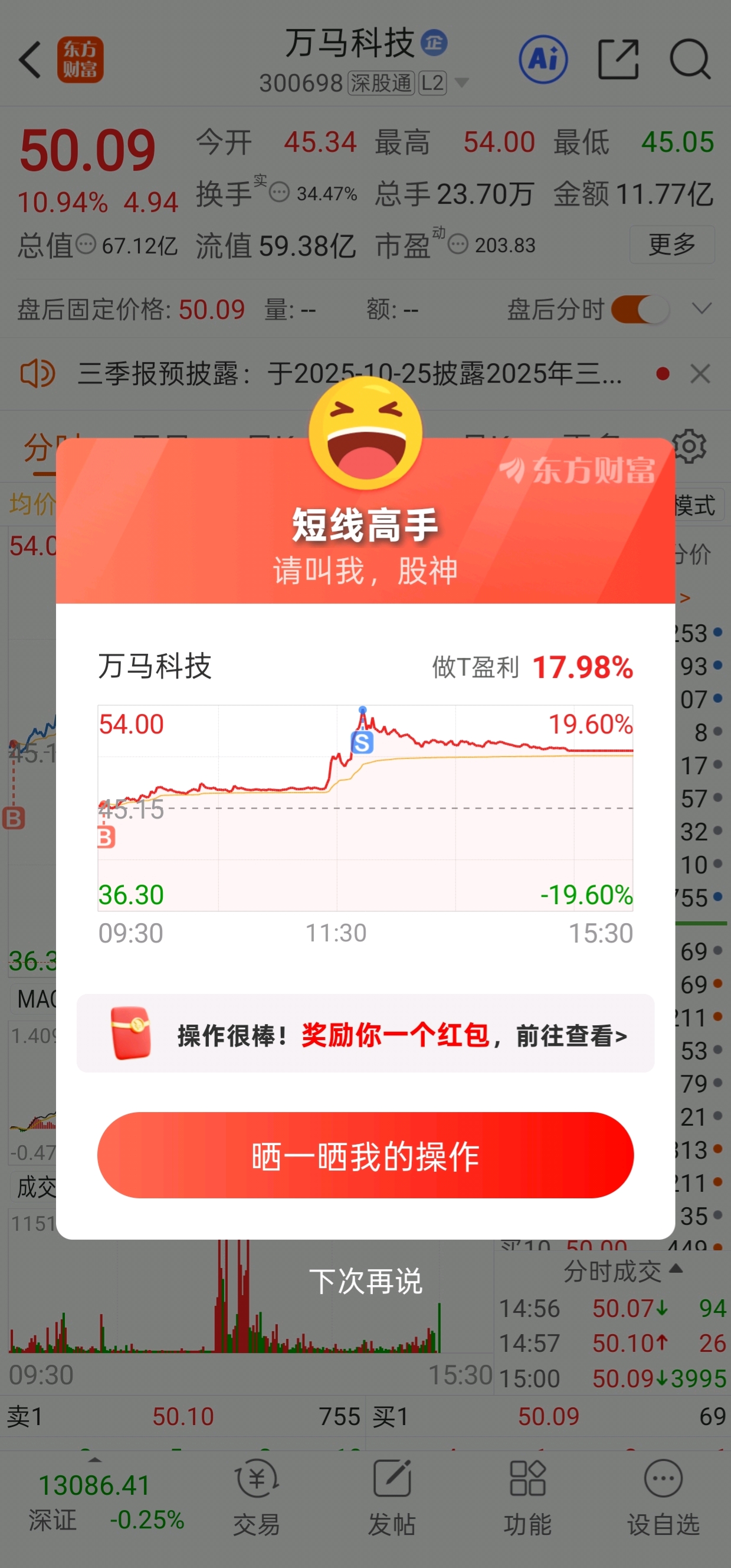 $万马科技(SZ300698)$ 今天完美了