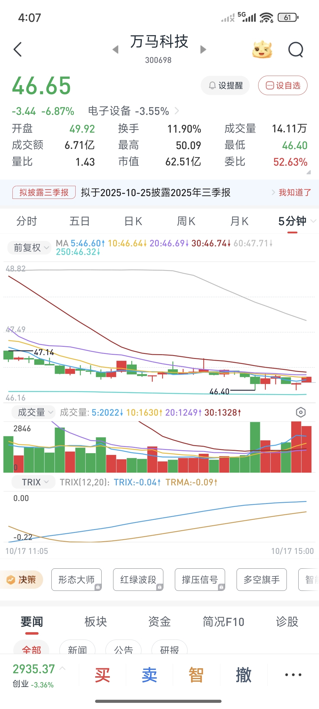 $万马科技(SZ300698)$ 昨天资金对倒到11.30分,中午打打关注度,下午放量吸引跟风盘,尾盘正常回落,今天配合大盘下跌测试抛压,下午5日线46.5-46.7一直横盘洗技术派,尾盘再次打下去引起恐慌,最后10分钟放量收回筹码,那就看看周末消息面,一旦大盘企稳,万马反弹在即,剧本如何,周一拭目以待。