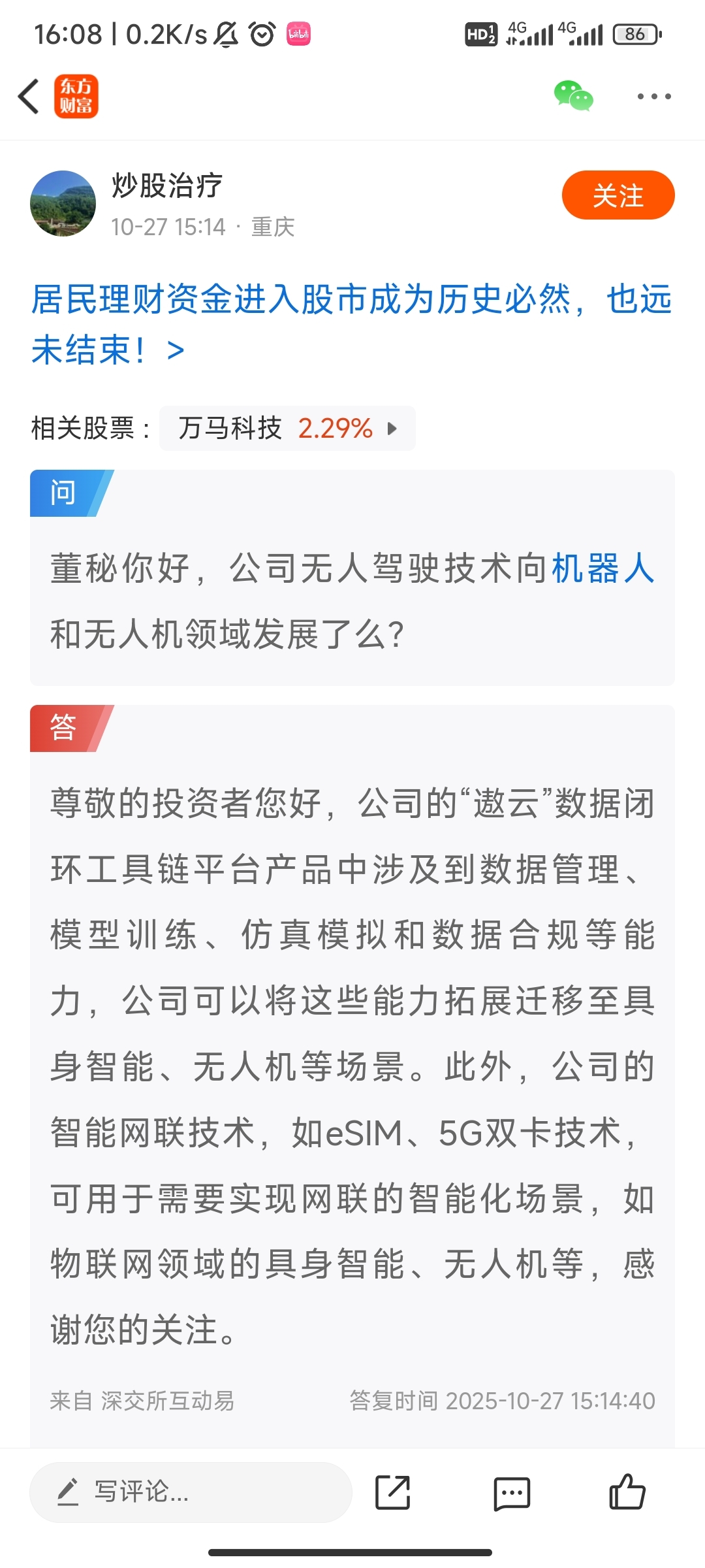 $万马科技(SZ300698)$ 董秘这是放飞自我了?具身智能(人形机器人),数据中心(算力),无人机(低空经济),智能驾驶,5G。这是把最前沿的技术都蹭一遍啊?但这个股价,啧啧