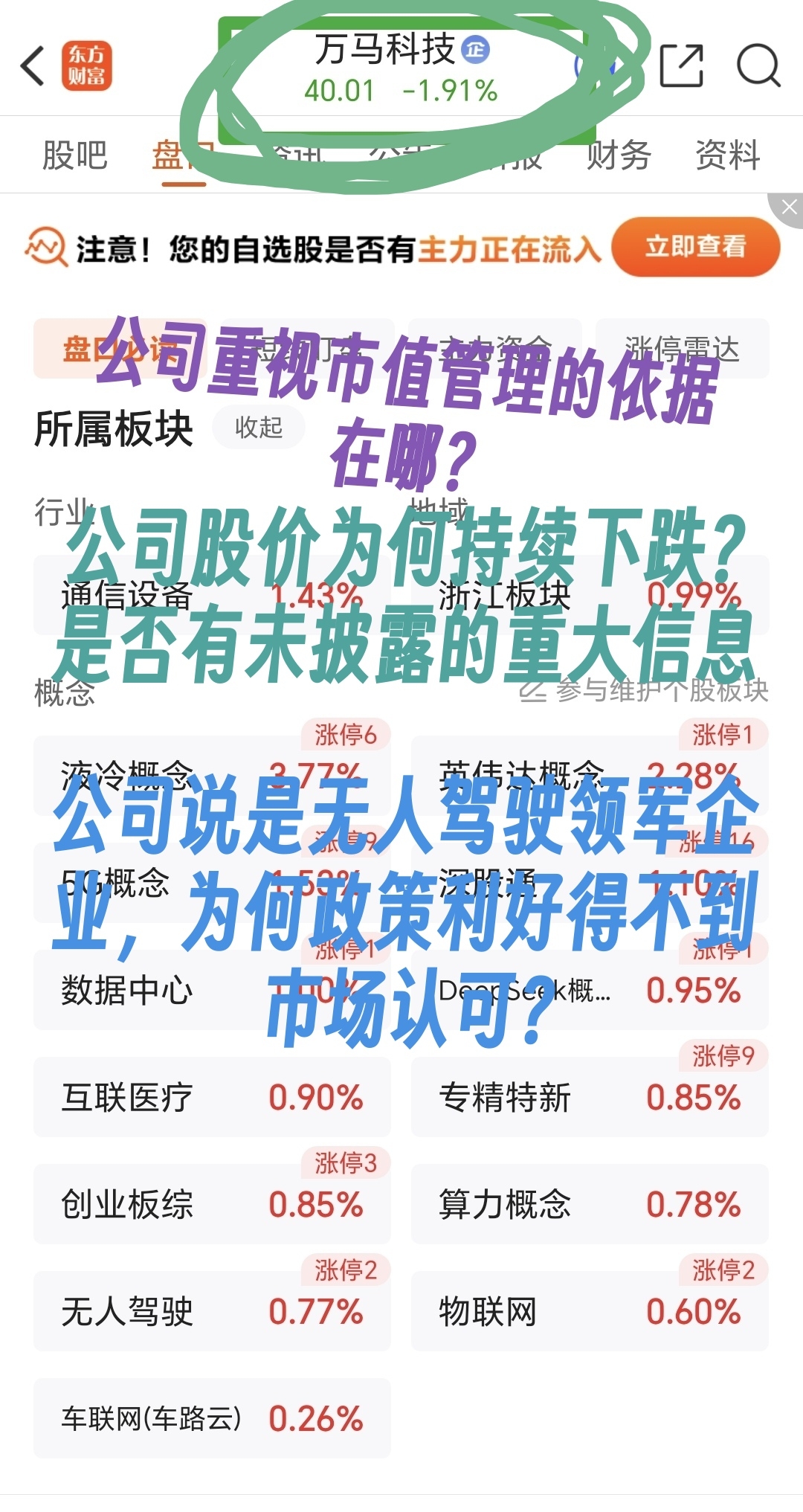 $万马科技(SZ300698)$ 三连问董秘:重视市值管理的举措在哪?为何股价逆板块逆大盘持续下跌,是否有未披露信息?说自己是无人驾驶领军企业,为何不能获得市场和资金认可?