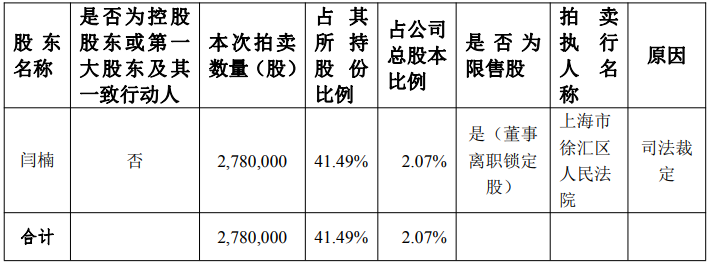 若本次司法拍卖成交并过户登记,闫楠持股将由670万股减少至392万股,占公司股本的比例将由5.00%降至2.93%,不再是公司5%以上股东。