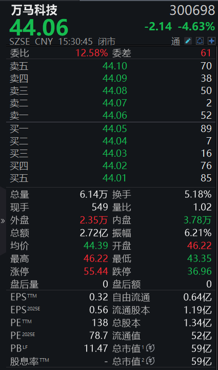 万马科技成立于1997年,2017年8月在深交所上市。公司主营产品广泛用于IDC机房、云平台建设、通讯网络、医疗领域、国家高铁、轨道交通等众多领域。截至今日收盘,万马科技报44.06元/股,下跌4.63%。