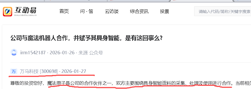 万马科技助力人形机器人“魔法原子”(MagicBot)春晚翻跟斗倒立!万马科技官方明确表示,魔法原子为其合作伙伴,双方聚焦于具身智能语料的采集、处理与应用,合作方向为AI训练数据支持与智能交互系统优化。详见截图如下: