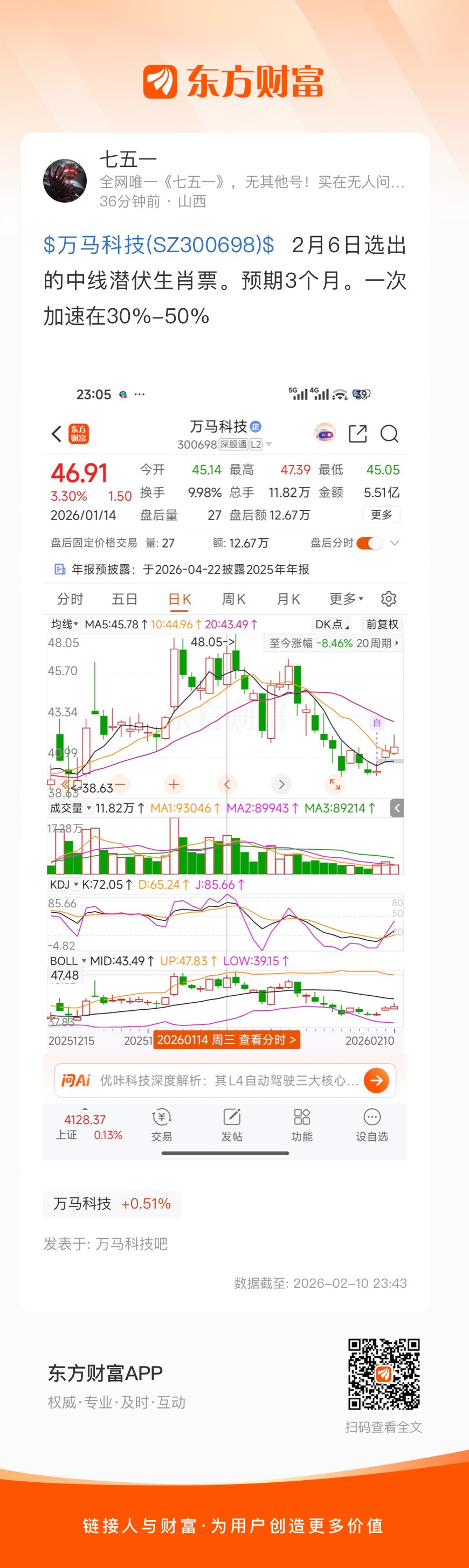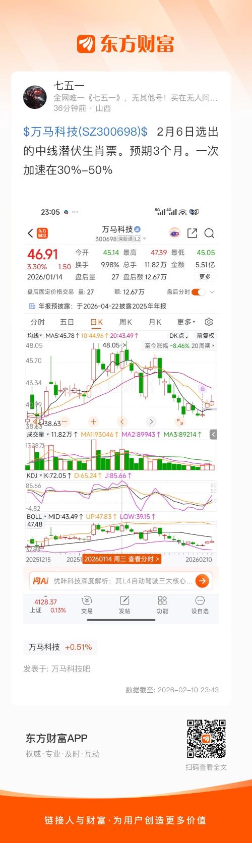 $万马科技(SZ300698)$  2月6日选出的中线潜伏生肖票。预期3个月。一次加速在30%-50%