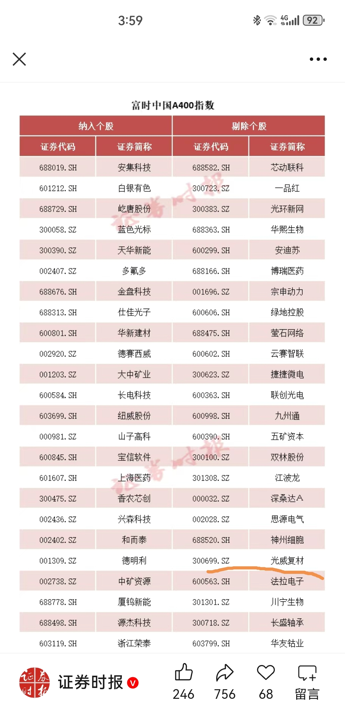 $光威复材(SZ300699)$ 光威被剔除富时A400。