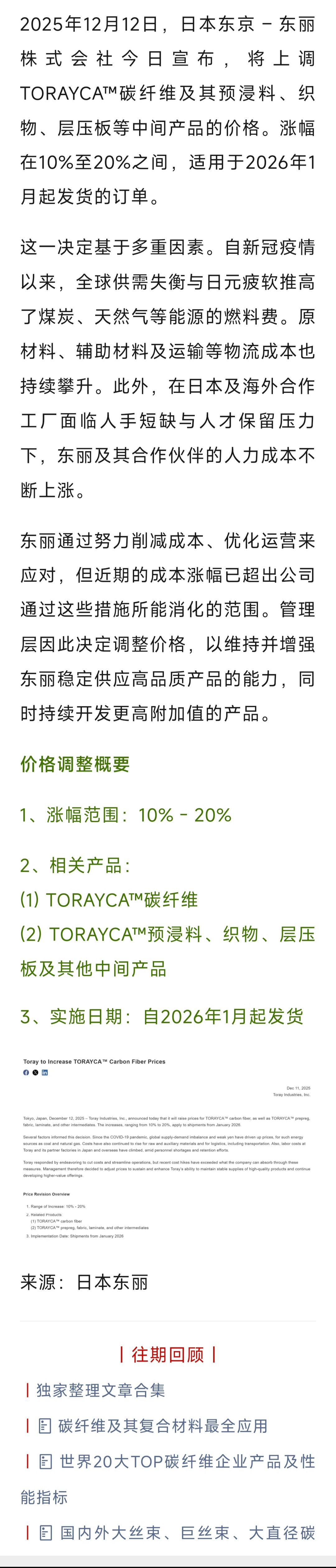 $光威复材(SZ300699)$ 重磅关注·东丽将提高TORAYCA™碳纤维价格,涨幅范围10%-20%