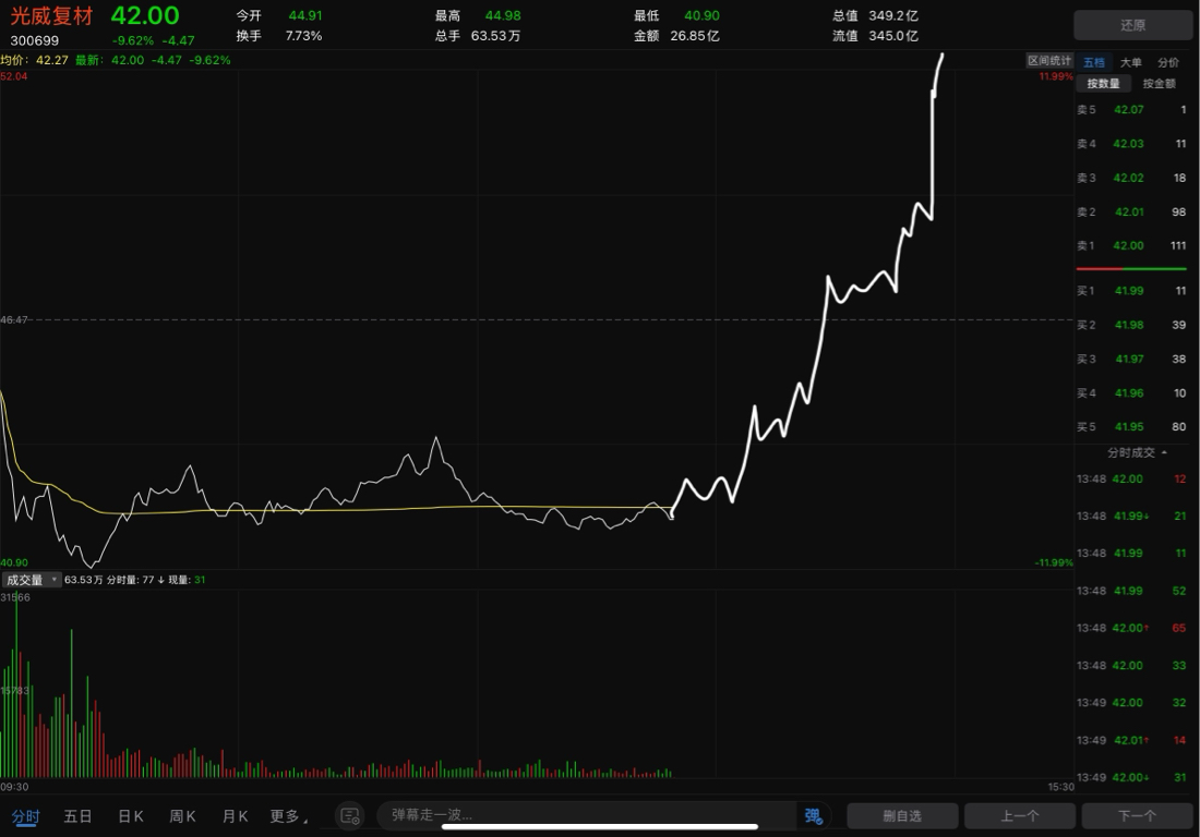 $光威复材(SZ300699)$ 日内尾盘预测
