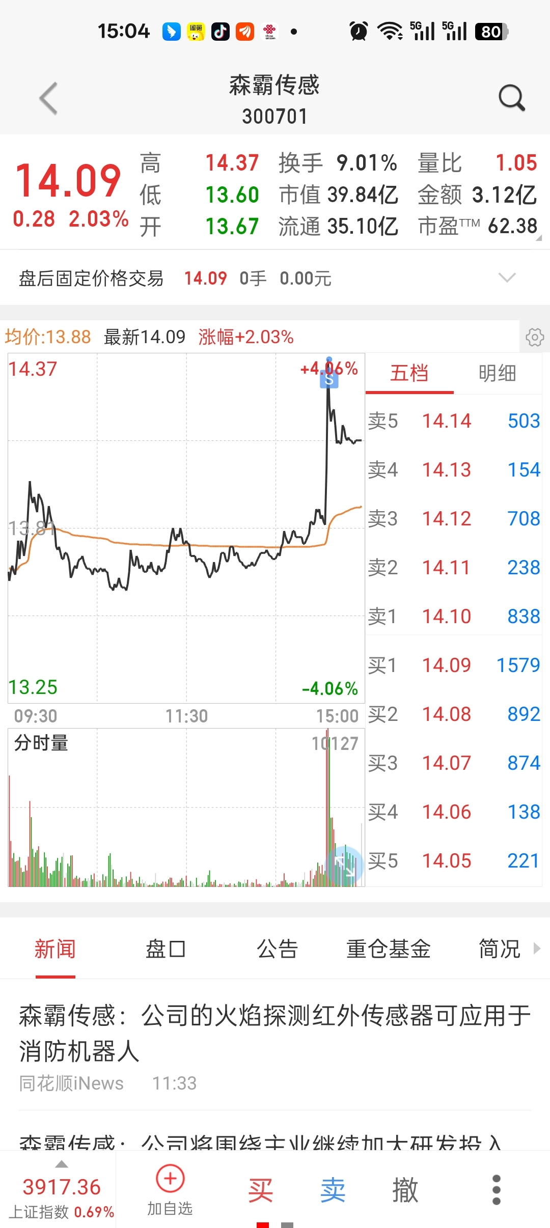 $森霸传感(SZ300701)$ 走一部分先,主力加油