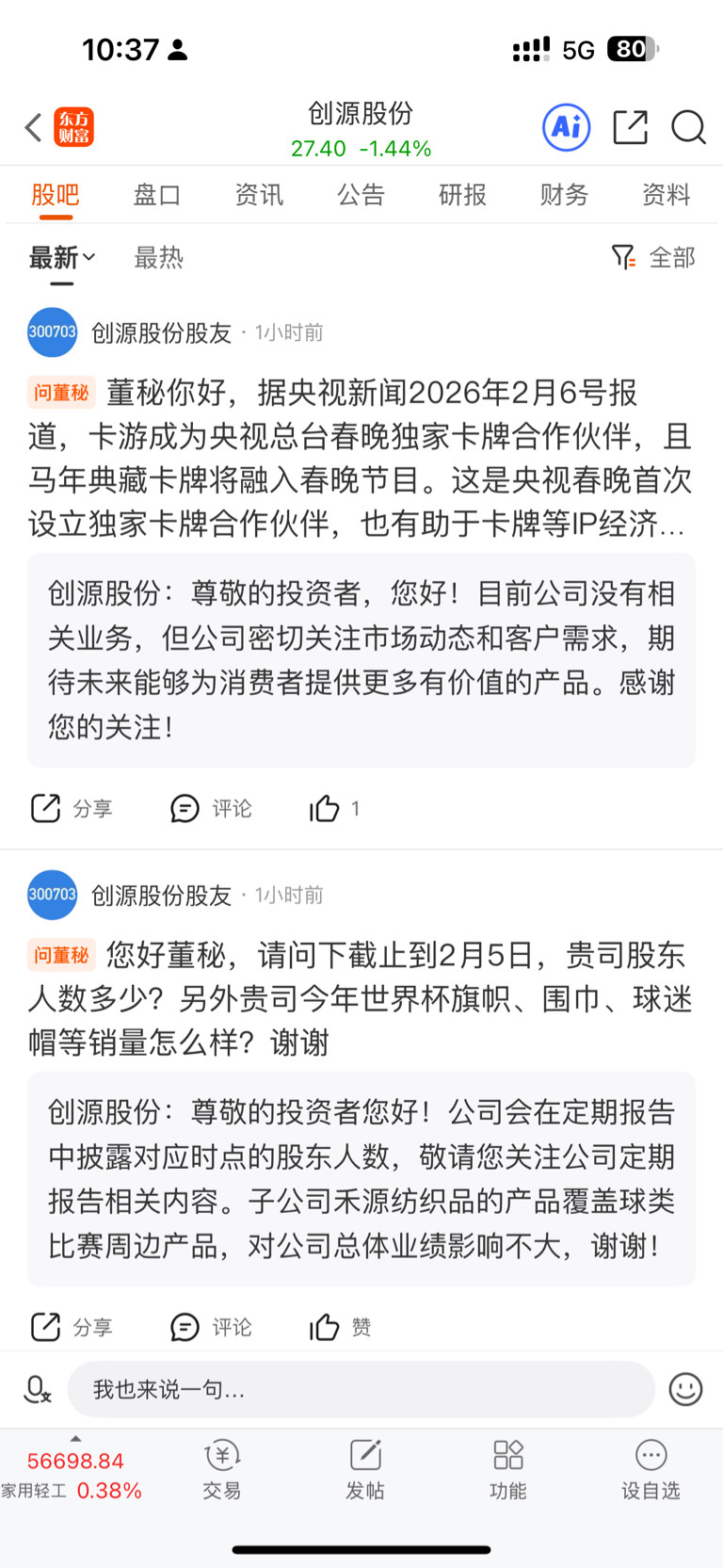$创源股份(SZ300703)$ 股吧真有几个人才,问这种问题,看着别的自选一片大红,创源股价却击穿某些人的心理防线。不断自我安慰,不断的幻想第二天的上涨,所以说,有些人真的凭实力亏钱,怪不得人家说有些人亏钱是命中注定,亏钱配的上自己的认知。(跳梁小丑一定会来评论)