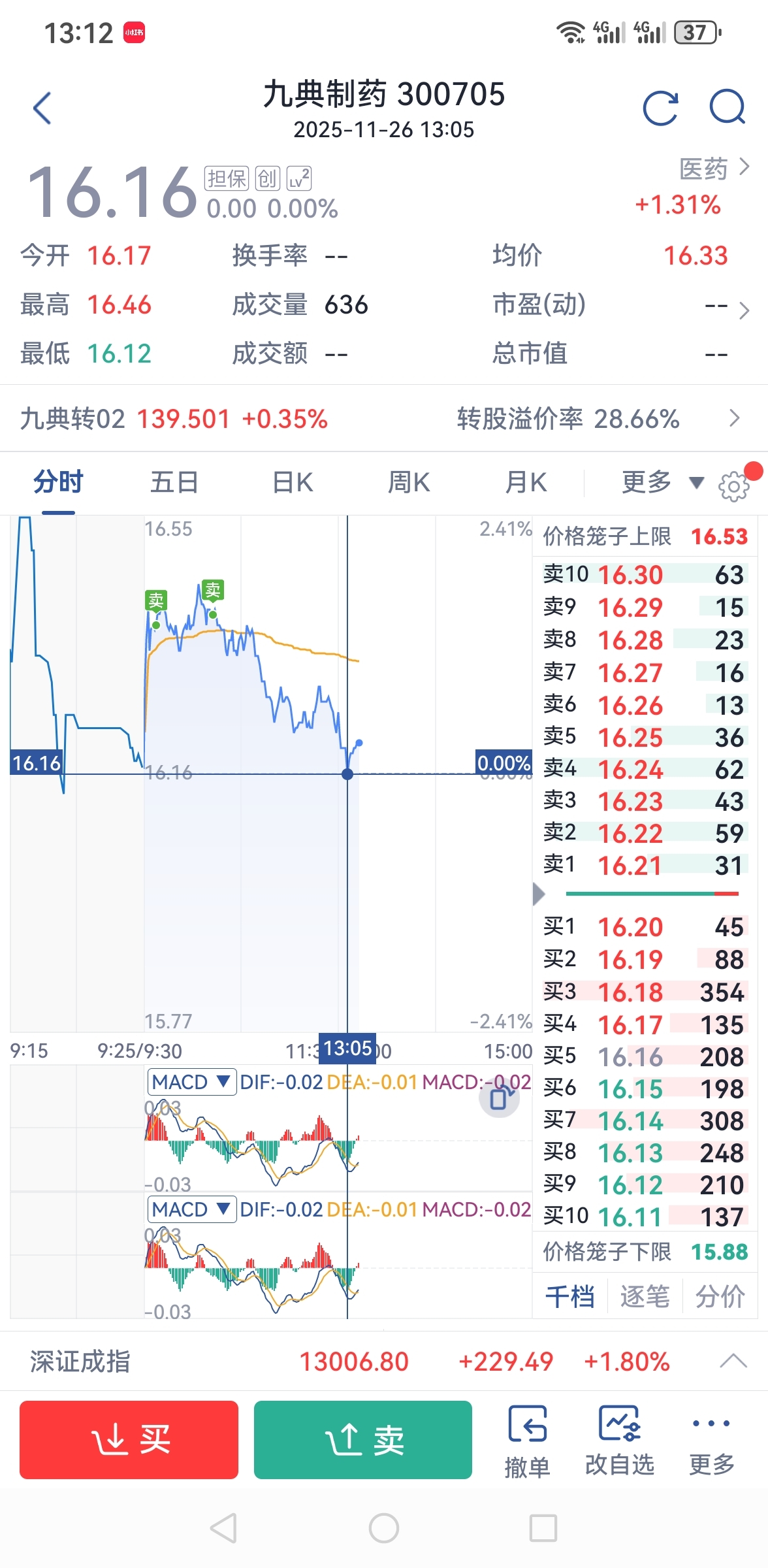 $九典制药(SZ300705)$ 太弱了跑不赢板块这两天,还是出了16.18不接了