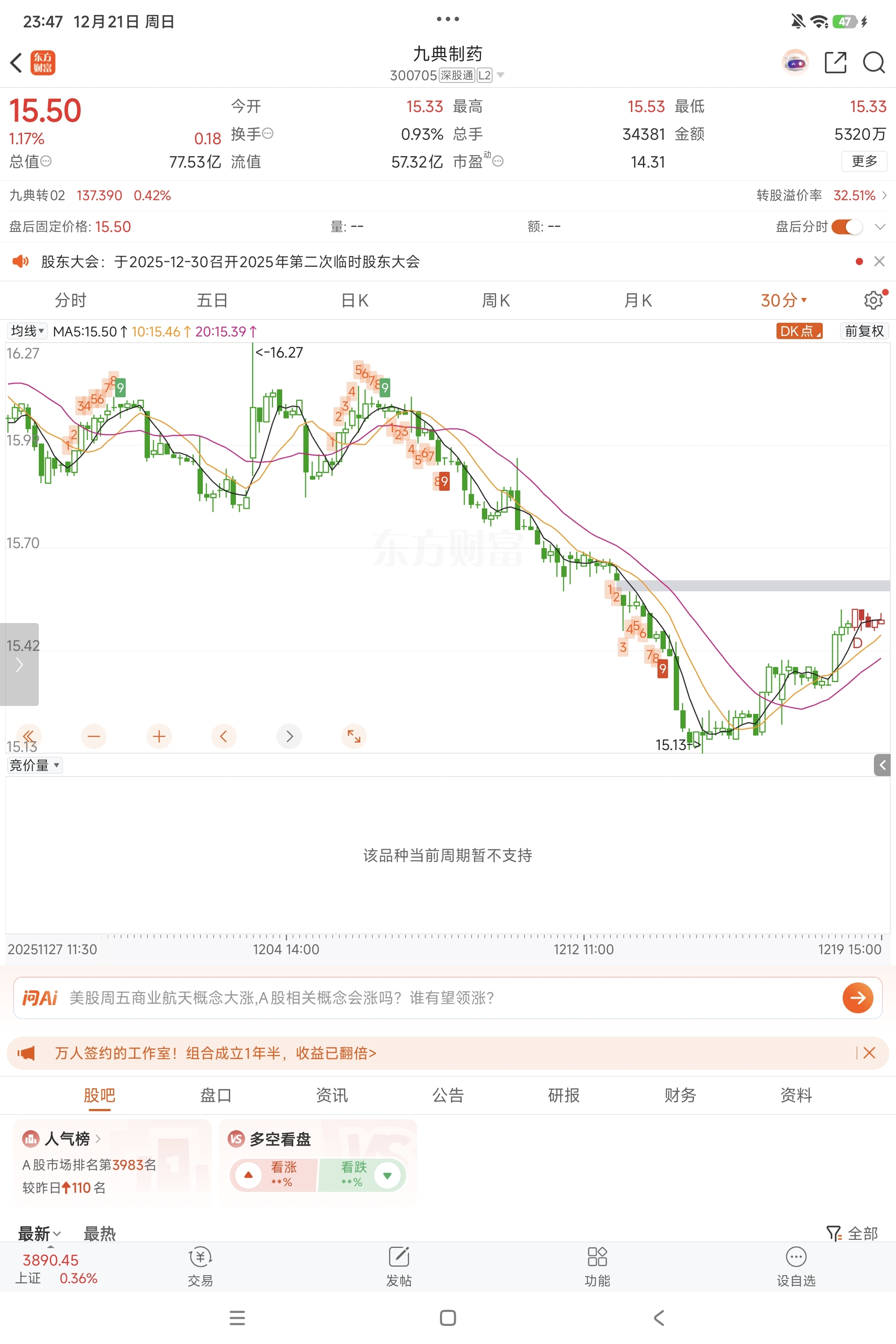 $九典制药(SZ300705)$ 30分钟线出买入信号了,再就是连续三四天,最低价在增加。
