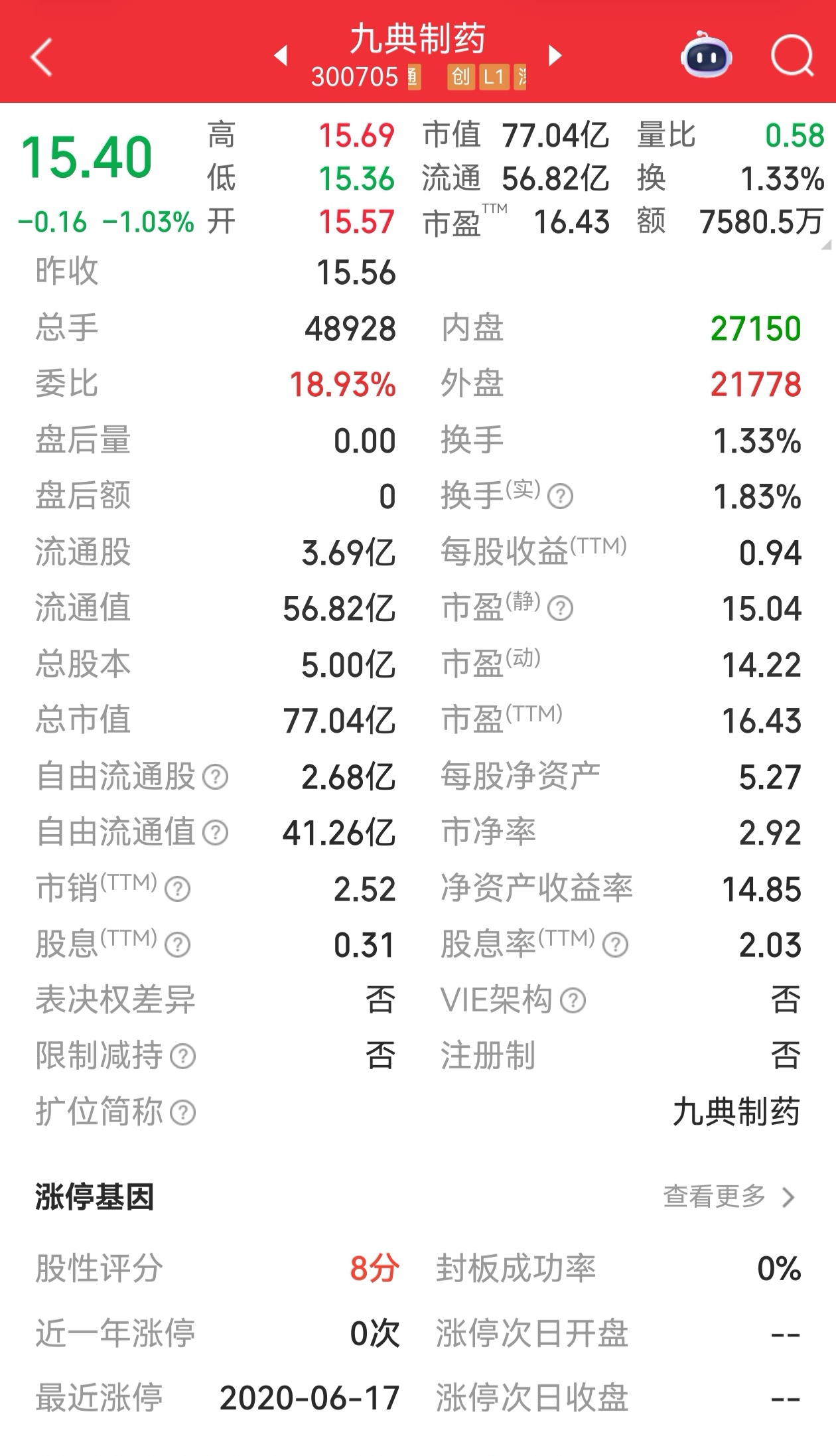 $九典制药(SZ300705)$ 几年都没有涨停过一次