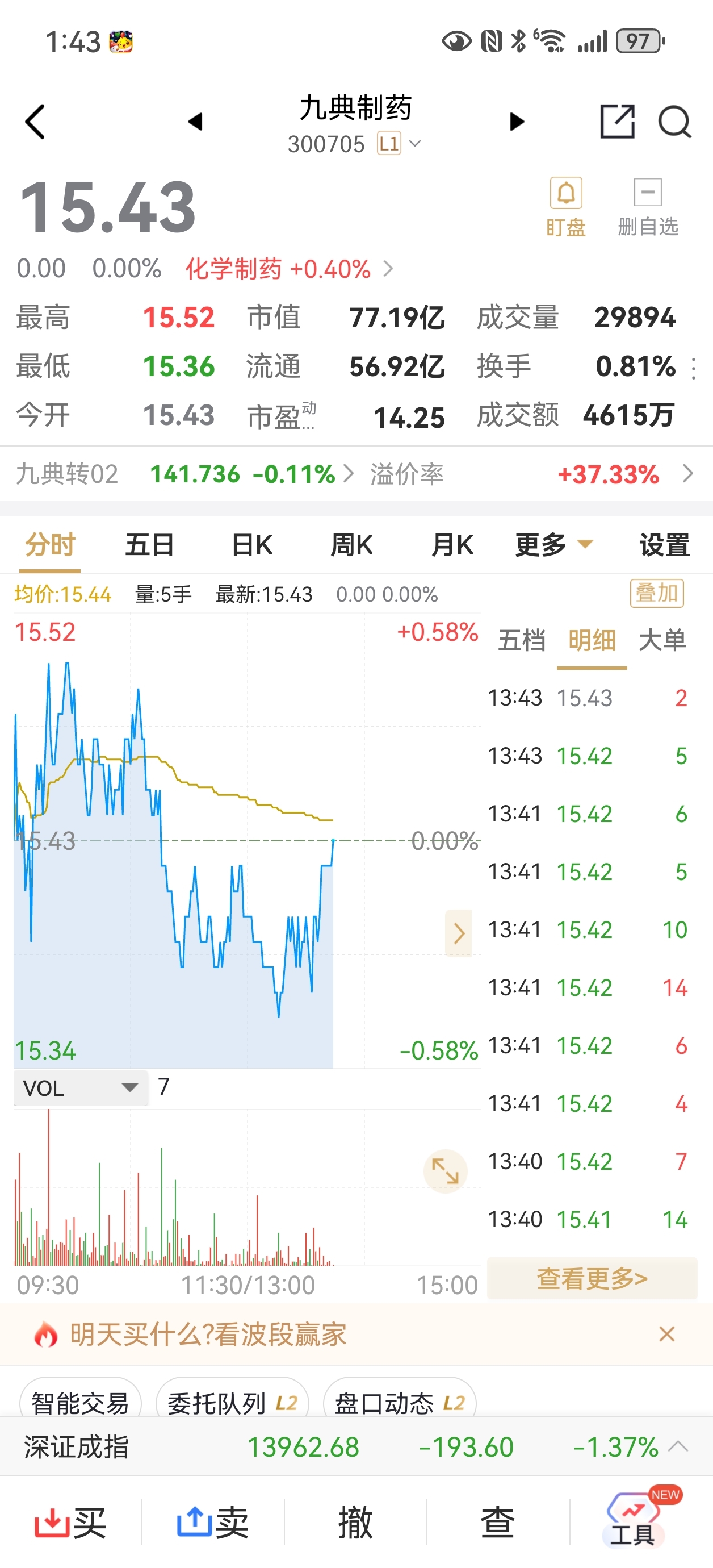$九典制药(SZ300705)$ 没成交量了快下来吧!我等着呢