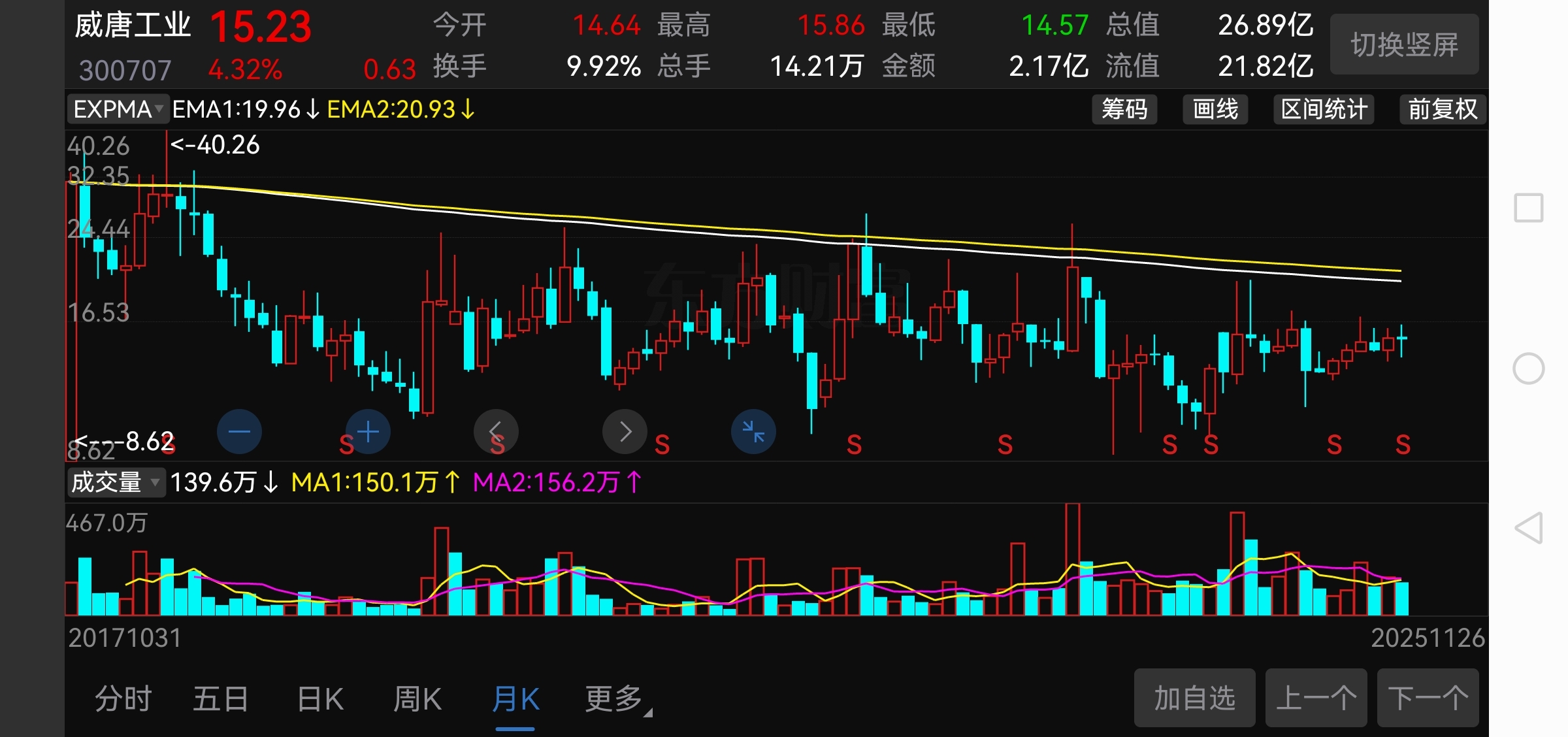 $威唐工业(SZ300707)$ 又是个卄句庄股,每根倍量阳底必跌破,无支撑。