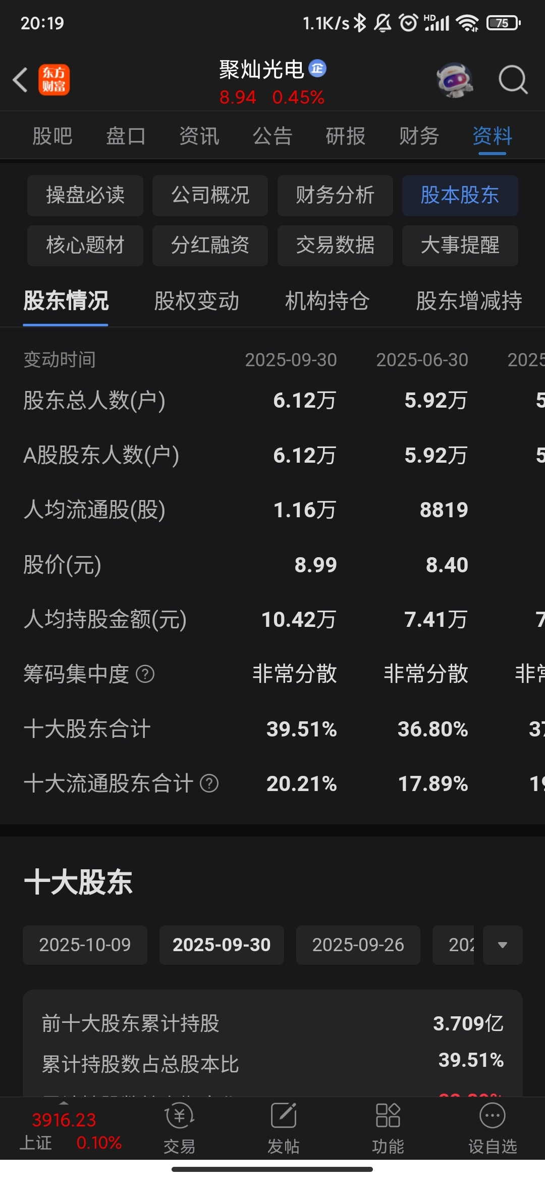 $聚灿光电(SZ300708)$ 好有意思的数字,今开8.99、最高9.55、换手13.55、总手96.22、成交金额8.99、流通值66.88,然后股东户数增多了,但是持股金额确变高了,就是不知道后面会怎么样???
