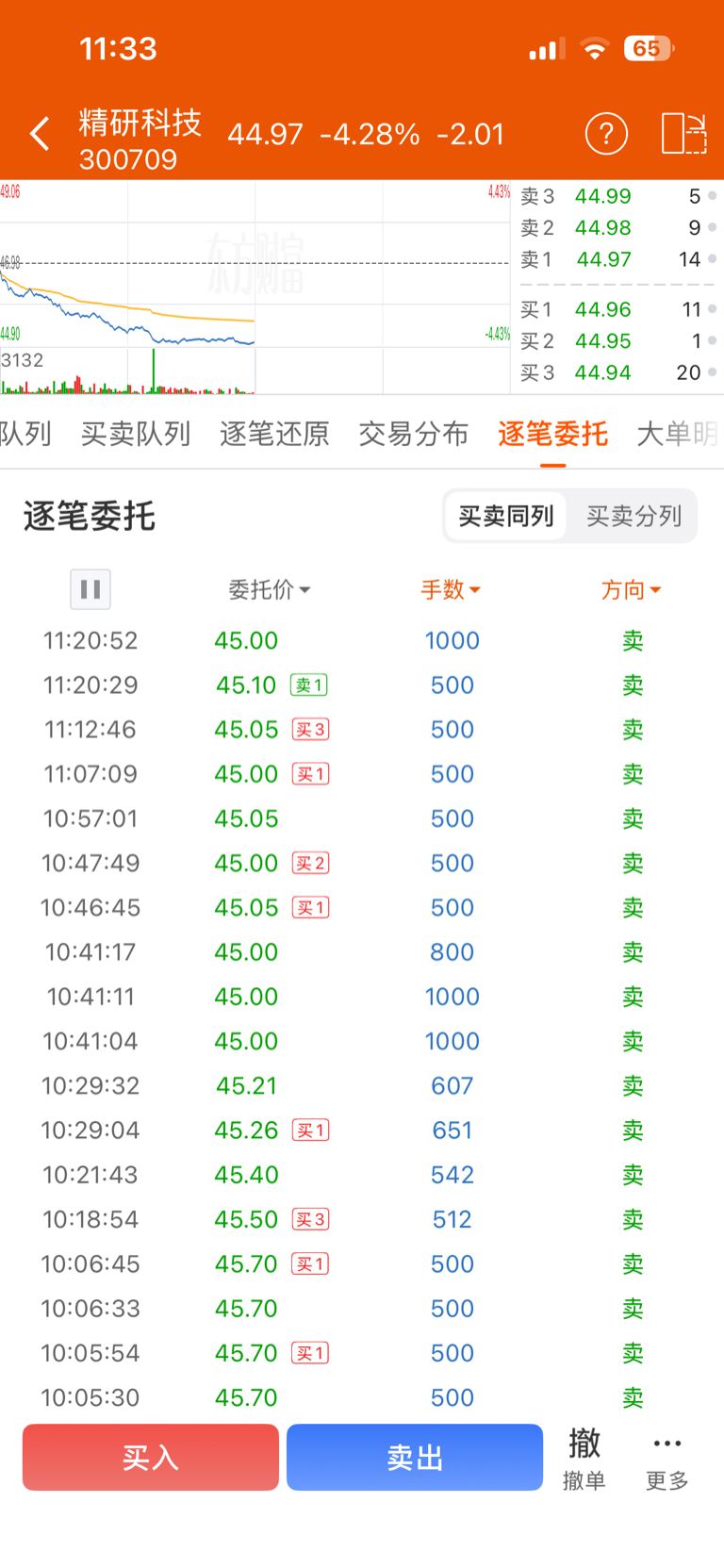 $精研科技(SZ300709)$ 这么整齐的单子,大户在跑还是史在减持?