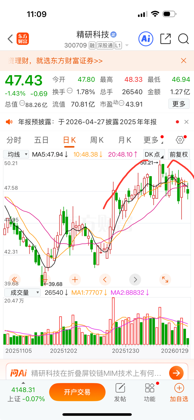 $精研科技(SZ300709)$ 漂亮的圆弧顶,高点一天比一天低,只需要看开盘