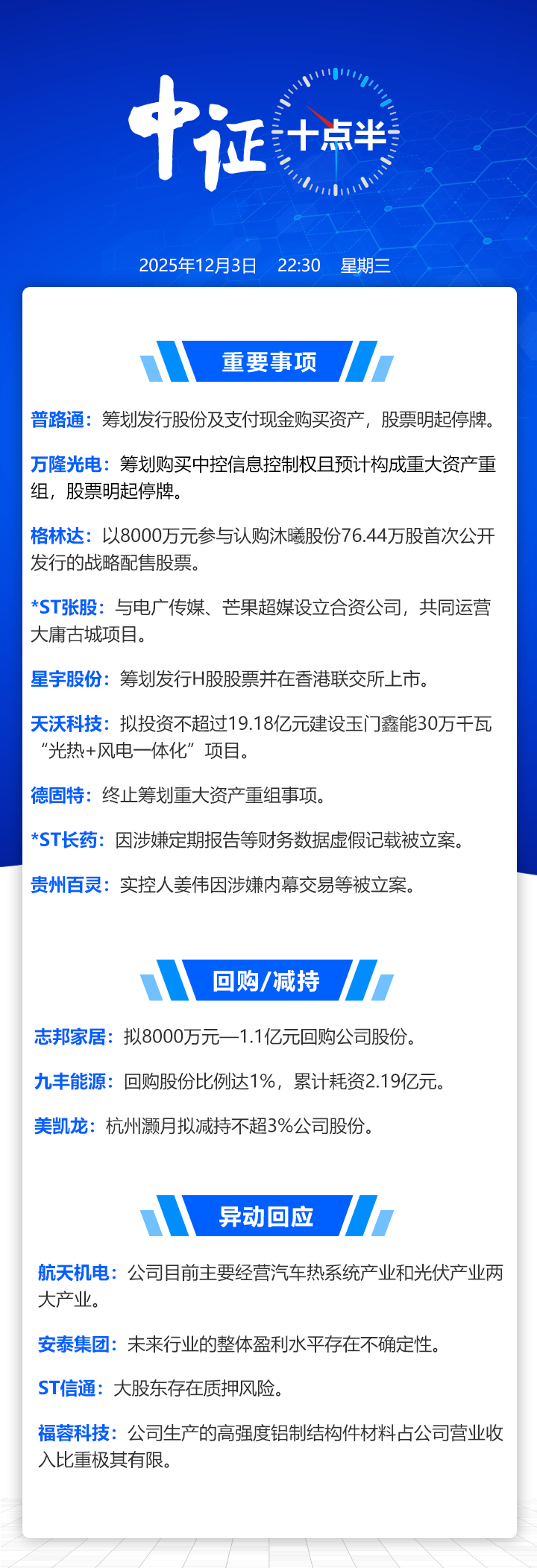 【中证十点半】万隆光电筹划重大资产重组;格林达认购沐曦股份76.44万股;德固特终止重大资产重组