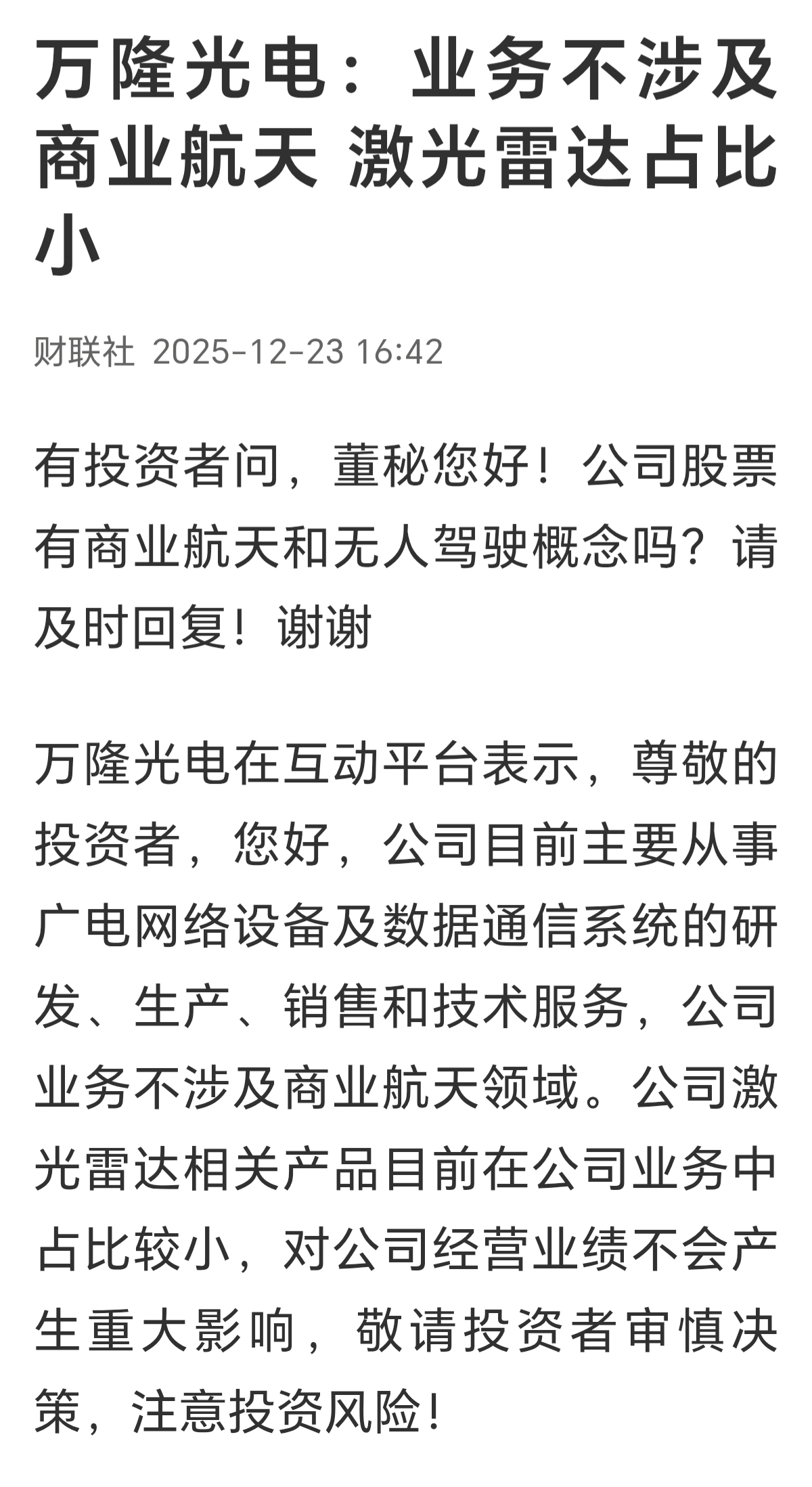 $万隆光电(SZ300710)$ 人家23号就说了不涉及商业航天,有些人怎么还在跟商业航天较劲