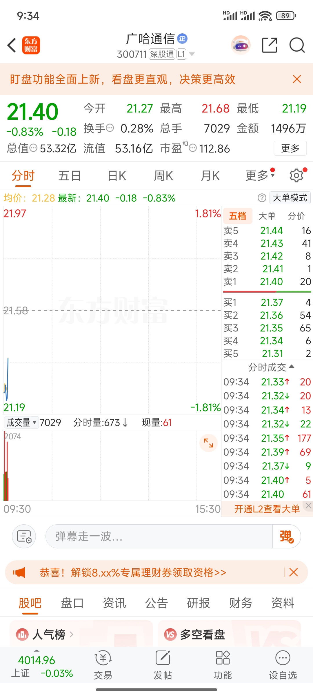 $广哈通信(SZ300711)$ 这3分钟 哪一笔成交是21.68?
