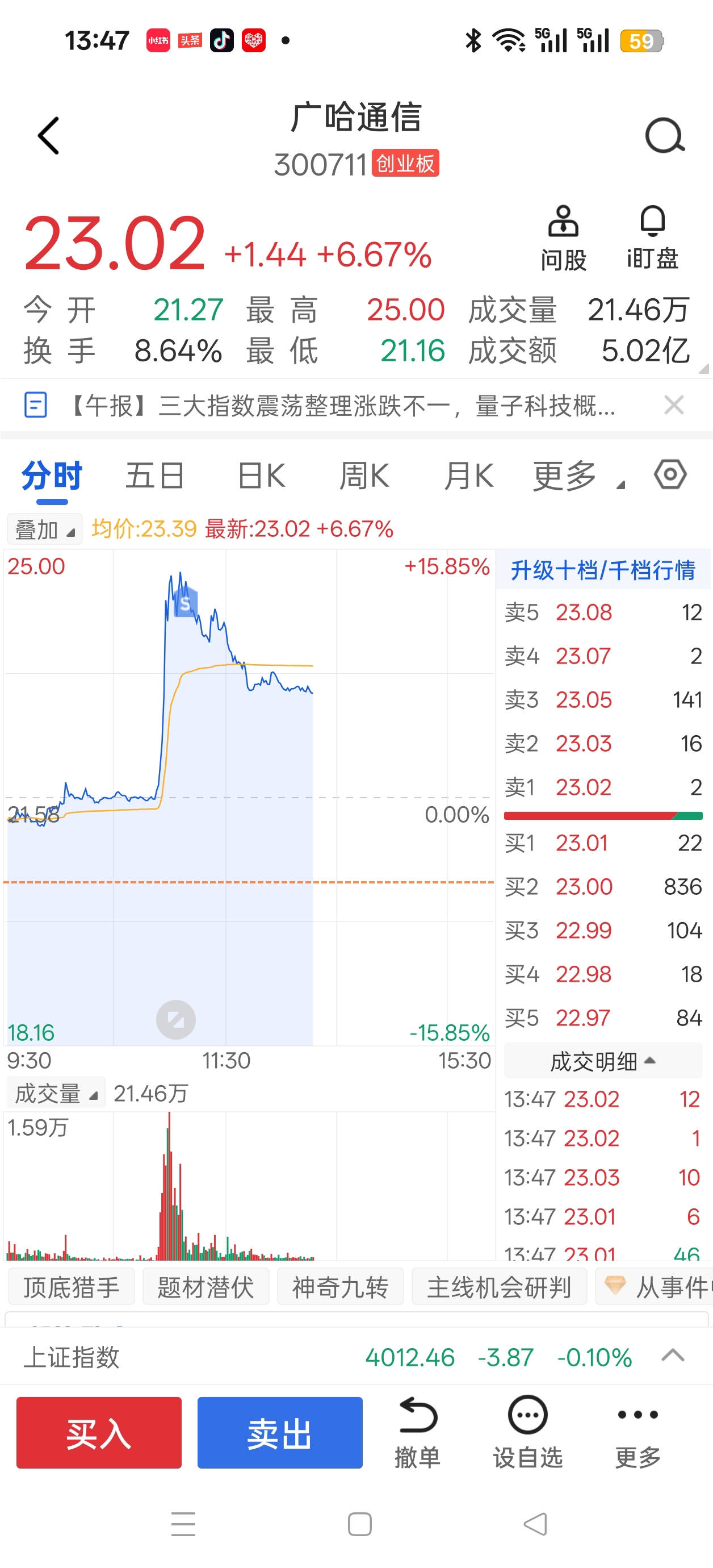 $广哈通信(SZ300711)$ 精准逃顶,再也不格局了,宁可卖飞。
