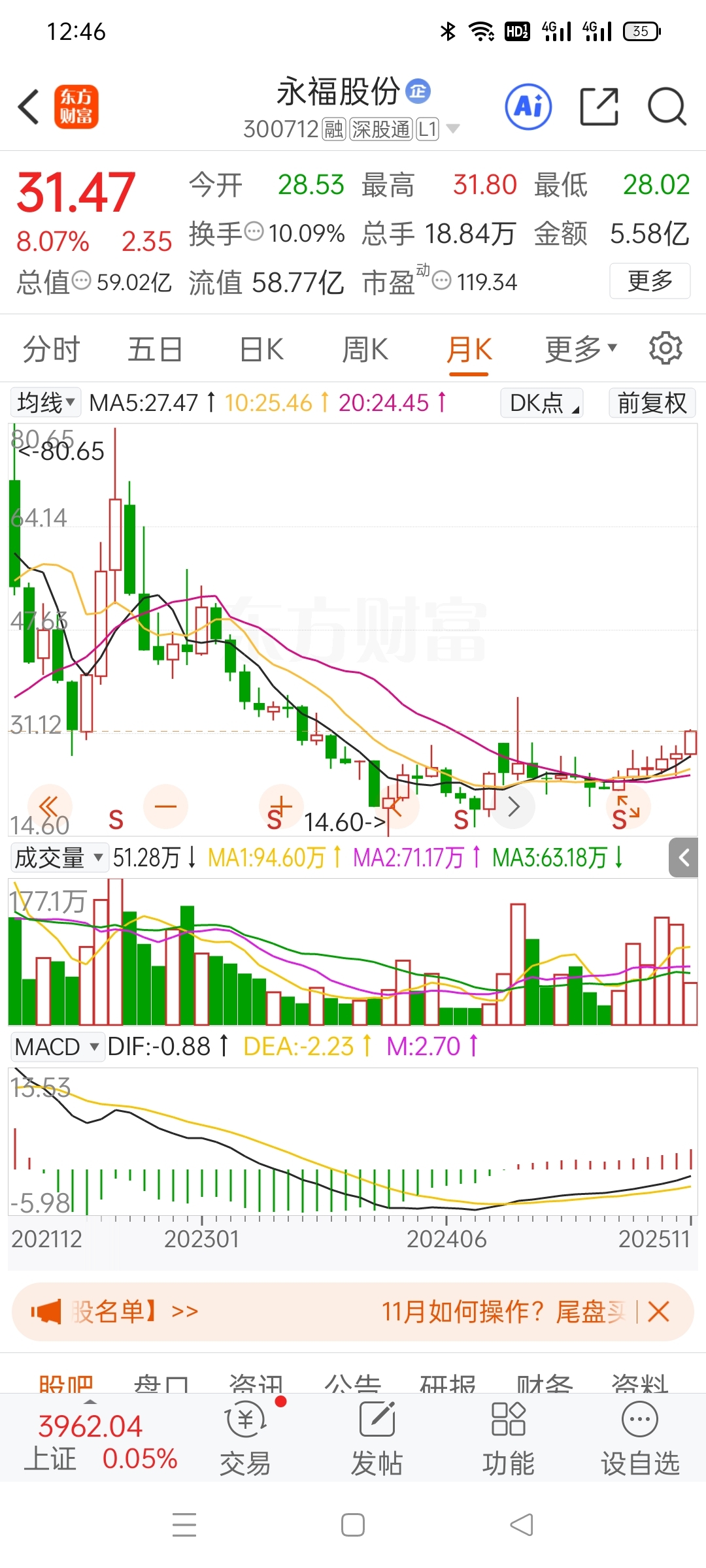 $永福股份(SZ300712)$ 电力+储能确定性可以,月线底部启动