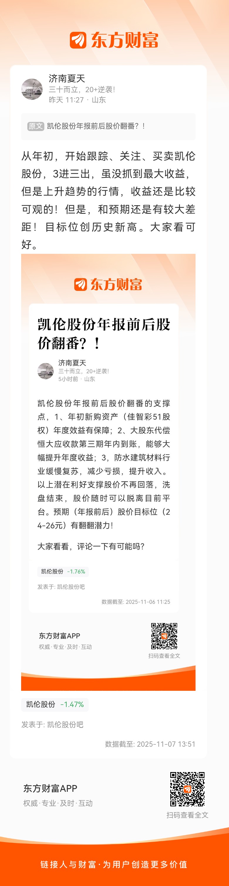 看好凯伦年报行情,低吸持股。//@济南夏天 :从年初,开始跟踪、关注、买卖凯伦股份,3进三出,虽没抓到最大收益,但是上升趋势的行情,收益还是比较可观的!但是,和预期还是有较大差距!目标位创历史新高。大家看可好。