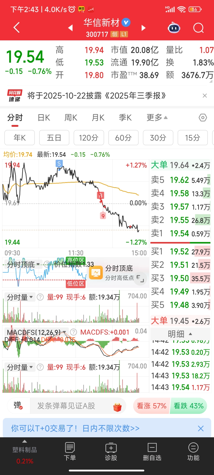 $华信新材(SZ300717)$ 早上看了下没有小盘股还是没有量,那就只能做T,原先想19.9以上在卖的,给了两次机会太贪了没卖,19.88卖了,原先看着底也应该就是19.69左右,挂的19.69买单,刚才一看买入了,然后19.69没守住继续跌我也是颓了啊,还剩下点仓位全仓梭哈