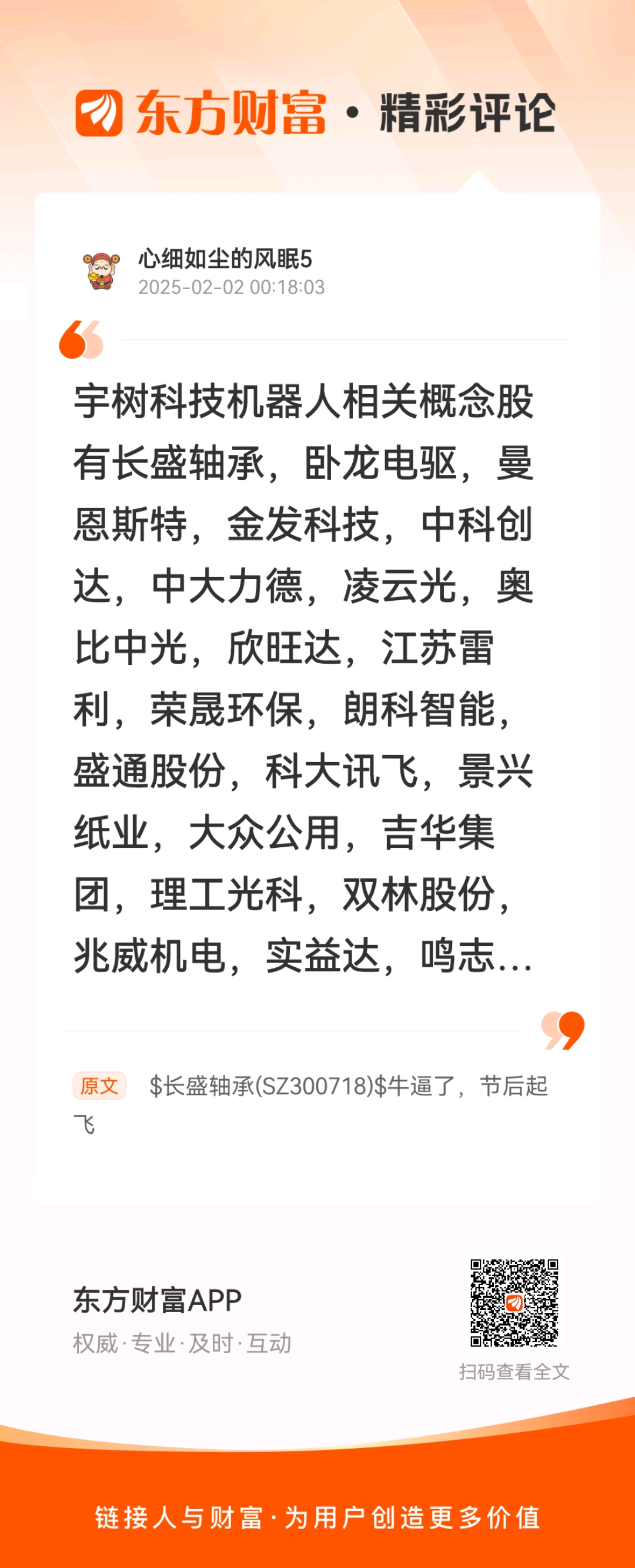 //@心细如尘的风眠5 :宇树科技机器人相关概念股有长盛轴承,卧龙电驱,曼恩斯特,金发科技,中科创达,中大力德,凌云光,奥比中光,欣旺达,江苏雷利,荣晟环保,朗科智能,盛通股份,科大讯飞,景兴纸业,大众公用,吉华集团,理工光科,双林股份,兆威机电,实益达,鸣志电器,五洲新春,汉威科技,东睦股份,全志科技,中际旭创,北纬科技,贝斯特,深信服,安培龙,万马股份,长盈精密,速腾聚创等。