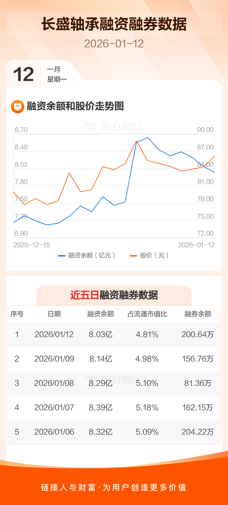 交易所最新数据显示,长盛轴承于2026年1月12日获融资买入1.27亿元,融资偿还1.38亿元,当日融资净偿还1129.71万元。目前,该股融资余额8.03亿,占流通市值比例为4.81%。