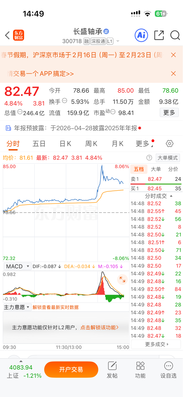 $长盛轴承(SZ300718)$ 2025年的1月28日春节联欢晚会宇树机器人首上台,一支舞就一鸣惊人,长盛轴承的股价在2月也涨至117.60,虽然时间也快一年了也没有看到突破,针对现在的表现也是乏力,大家也有些失望了,希望今年能在春晚后会有一波行情,我107的本加到103,现在满仓卧倒一年了,期待春暖花开时。
