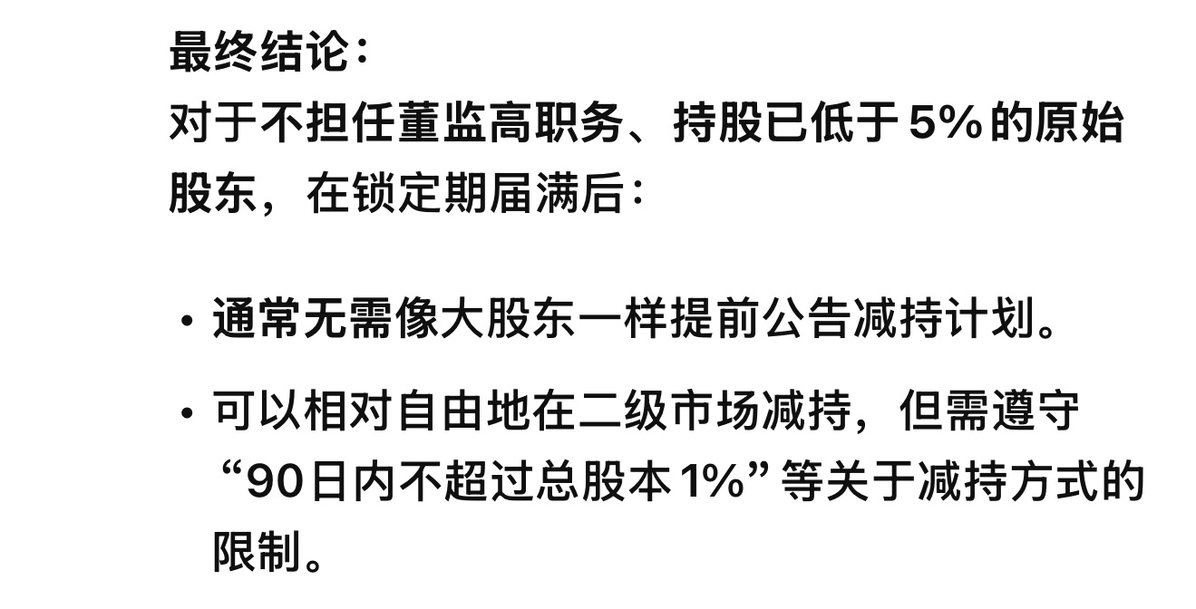 这次的减持无须公告,为什么要公告呢?原始股东90天内减持量不得超总股数的1%,这