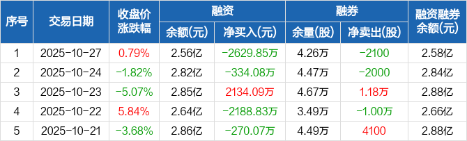 一品红:融资净偿还2629.85万元,融资余额2.56亿元(10-27)