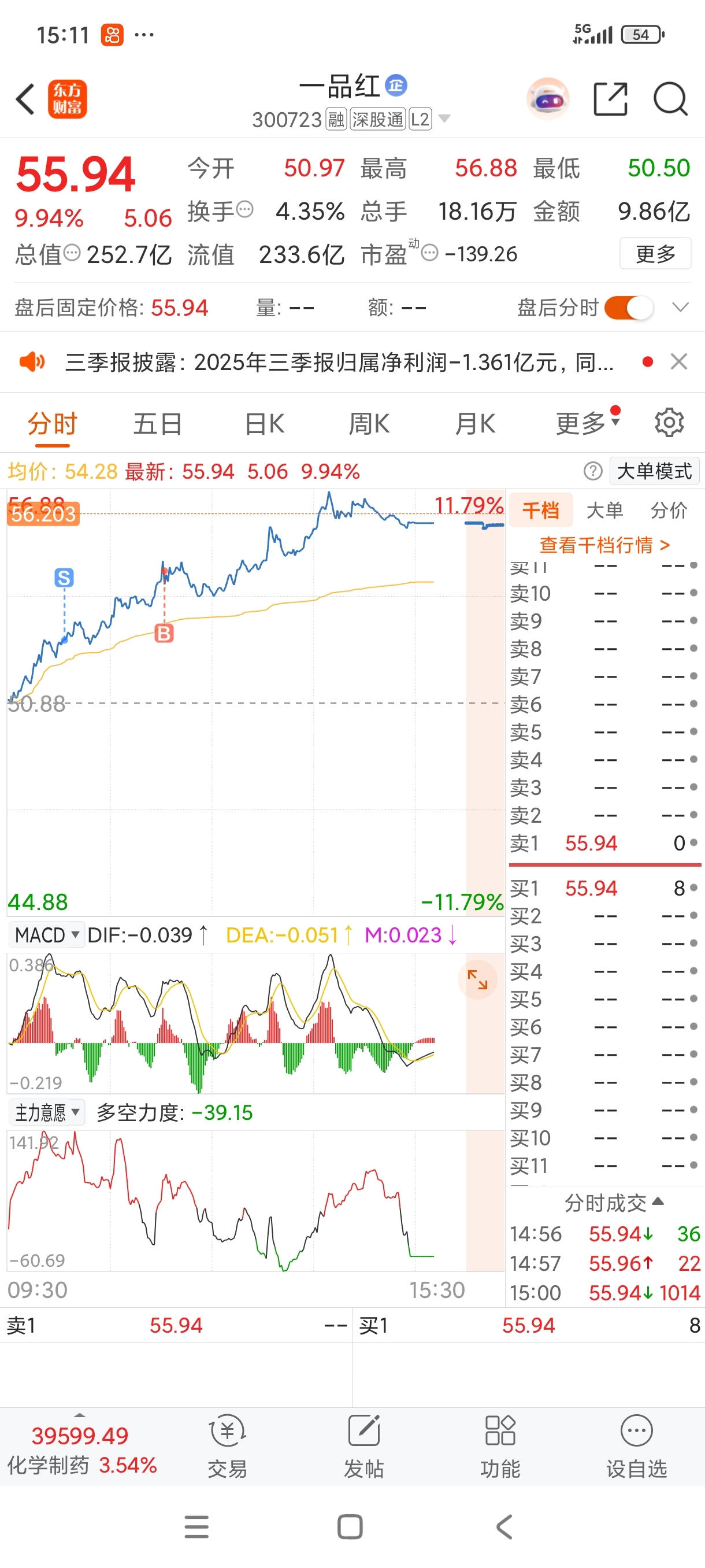 $一品红(SZ300723)$ 为什么每次都是这样卖就飞了,拿着就跌。六天没动了今天动了一下4个点没有了,本来好好的可以赚钱了还要亏钱,这是为什么?原本54.12本现在成了56.20本,为啥今天能涨那么多?