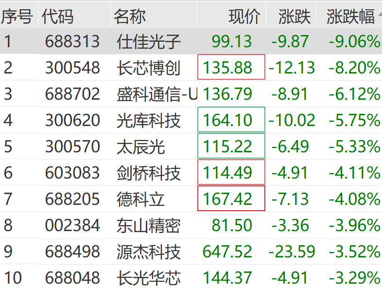 仕佳光子跌超9%,长芯博创、盛科通信、太辰光、剑桥科技等多股走低。