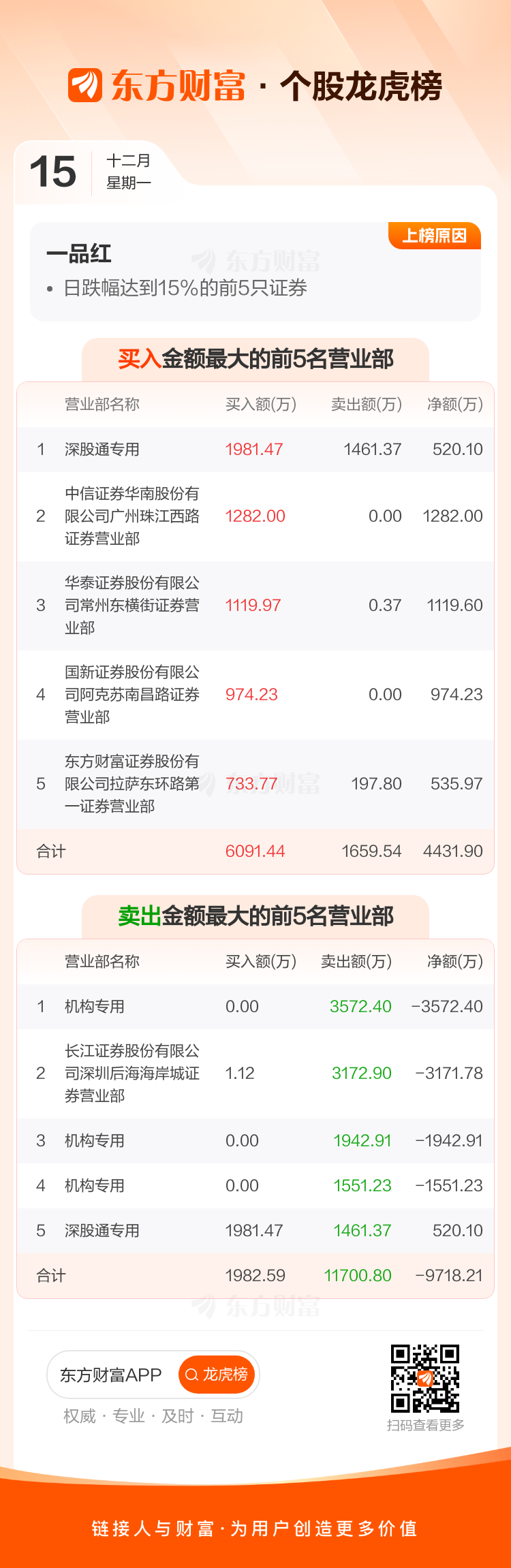 交易所2025年12月15日公布的交易公开信息显示,一品红因成为日跌幅达到15%的前5只证券上榜。一品红当日收报37.32元,涨跌幅-20.00%,偏离值-20.00%,换手率4.03%,成交额6.30亿。