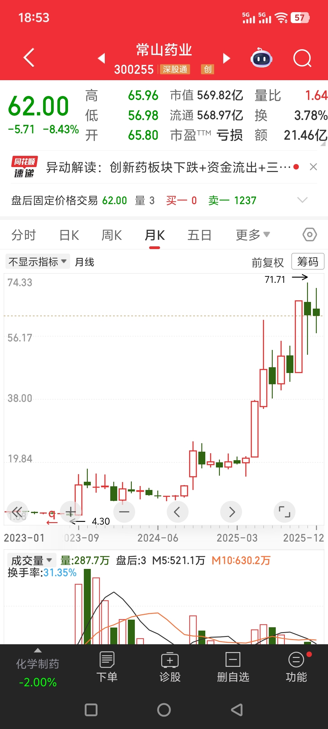 同为创新药的常山药业4块多启动涨到最高71目前总市值569亿净资产只有14亿这是