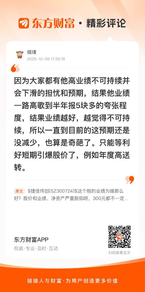 //@煅埥 : 因为大家都有他高业绩不可持续并会下滑的担忧和预期,结果他业绩一路高歌到半年报5块多的夸张程度,结果业绩越好,越觉得不可持续,所以一直到目前的这预期还是没减少,也算是奇葩了。只能等利好短期引爆股价了,例如年度高送转。