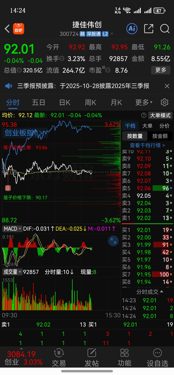 $捷佳伟创(SZ300724)$ 和创业板股指波动情况几乎完全一致,只不过创业板几乎百点长阳,捷佳缺一直在红绿边缘挣扎