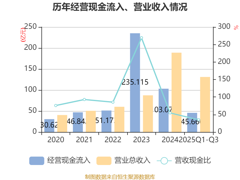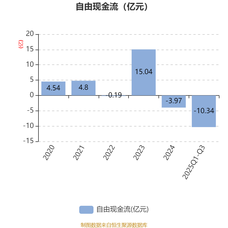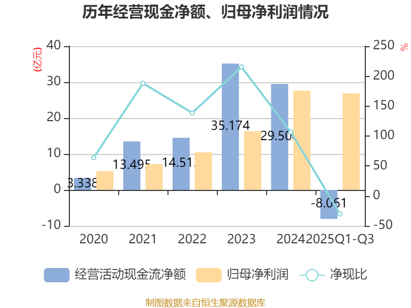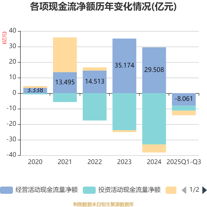 2025年前三季度,公司经营活动现金流净额为-8.06亿元,同比减少27.06亿元;筹资活动现金流净额-3亿元,同比增加1.68亿元;投资活动现金流净额-3.19亿元,上年同期为-38.5亿元。