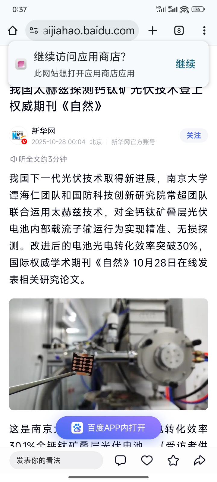 $捷佳伟创(SZ300724)$ 我国太赫兹探测钙钛矿光伏技术登上权威期刊《自然》