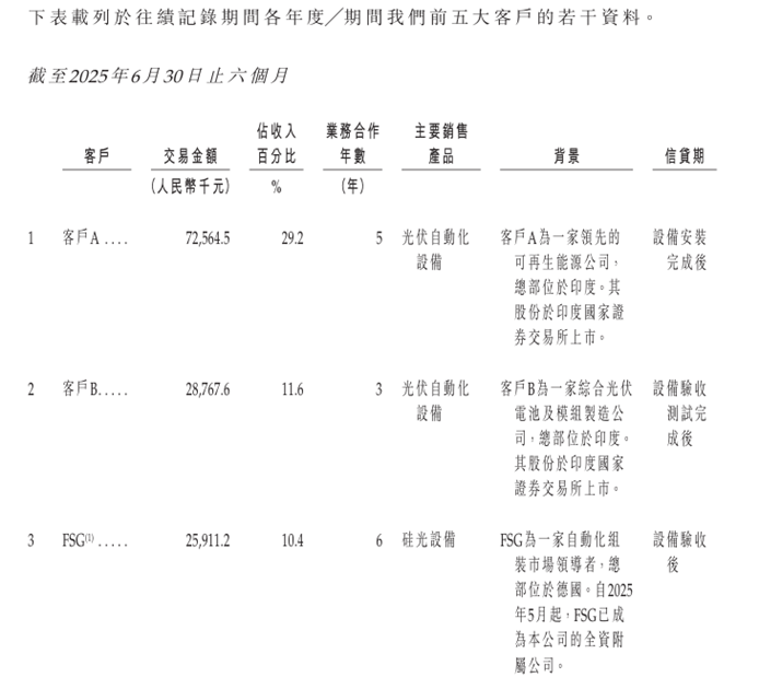 来自印度的客户A、客户B在2024年、2025年上半年,累计为公司贡献了1.89亿的销售额。罗博特科对这两个客户的信贷期分别是“设备安装完成后”与“设备验收测试完成后”。