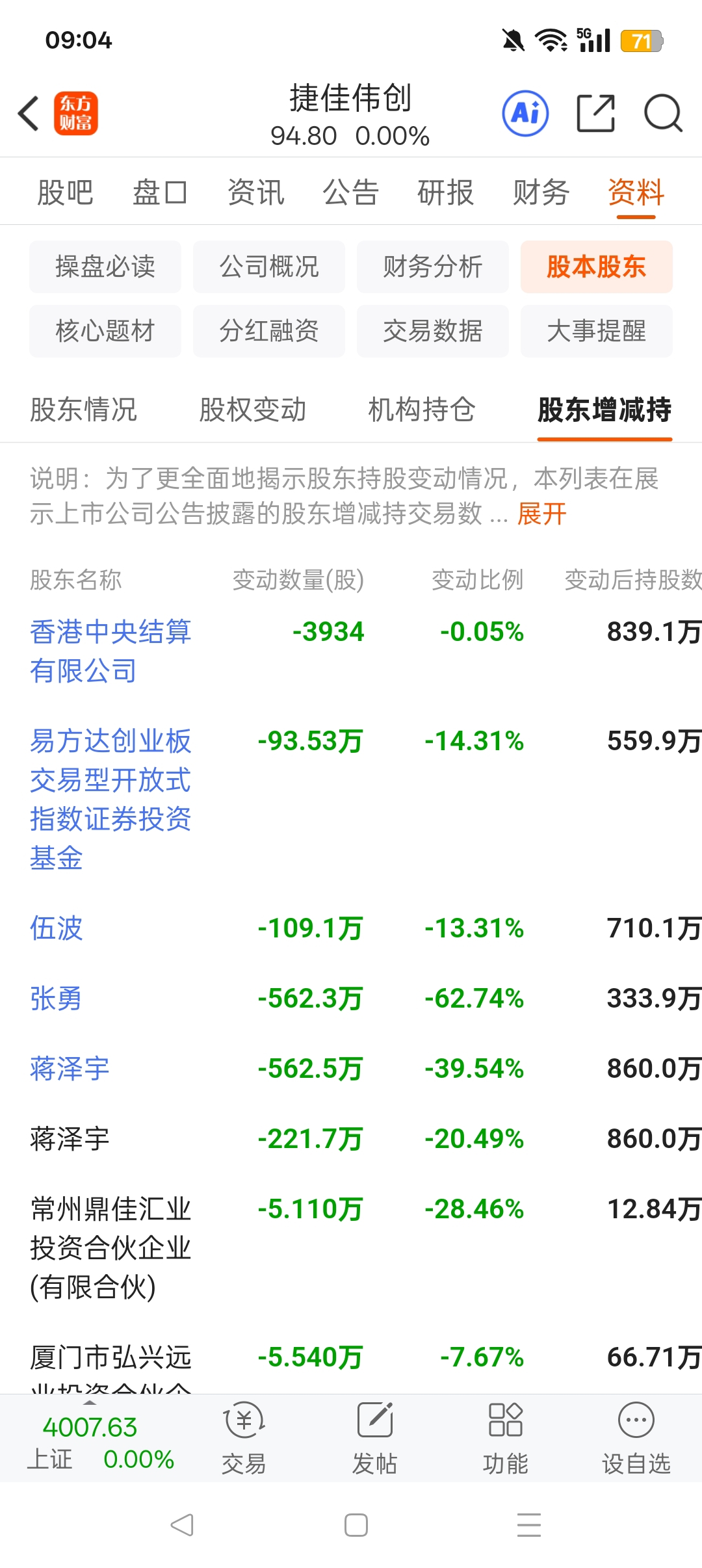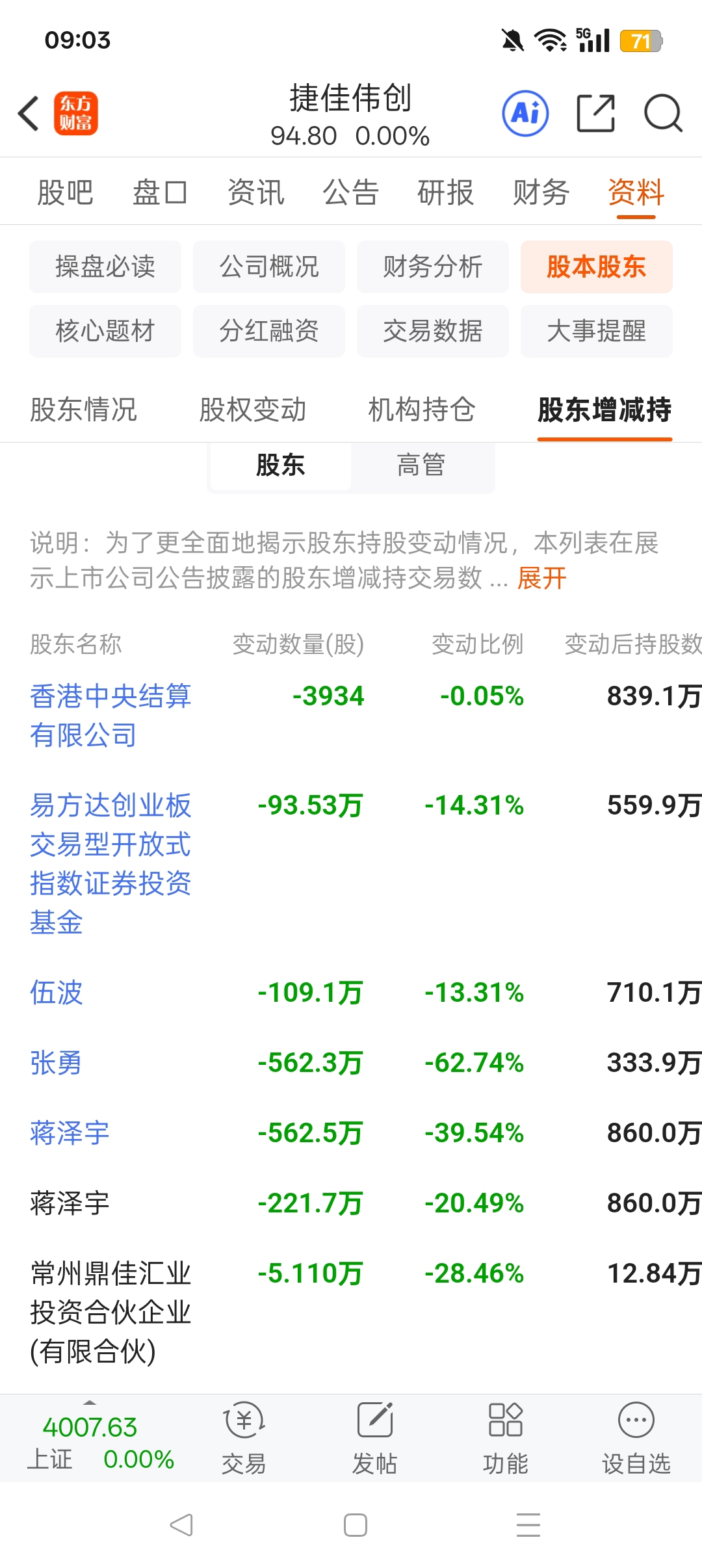 $捷佳伟创(SZ300724)$ 还在怪主力不拉?今年以来减持了2000万股了,单三季度减持了1800万股,单季度十大股东减持了自身-22%,你视而不见?如果你是主力,谁敢拉?有抱怨找减持的股东,高管去,不要转移注意力,天天股吧叽叽哇哇算什么英雄好汉。