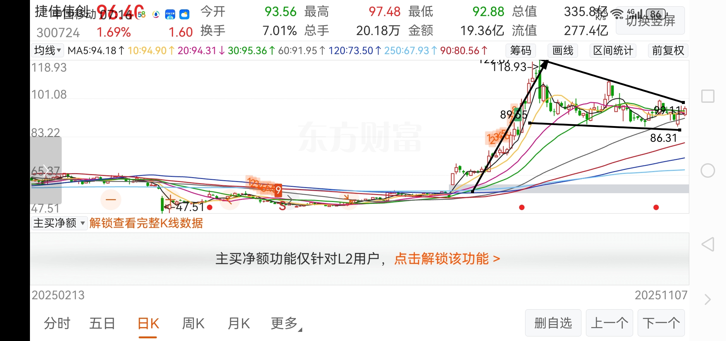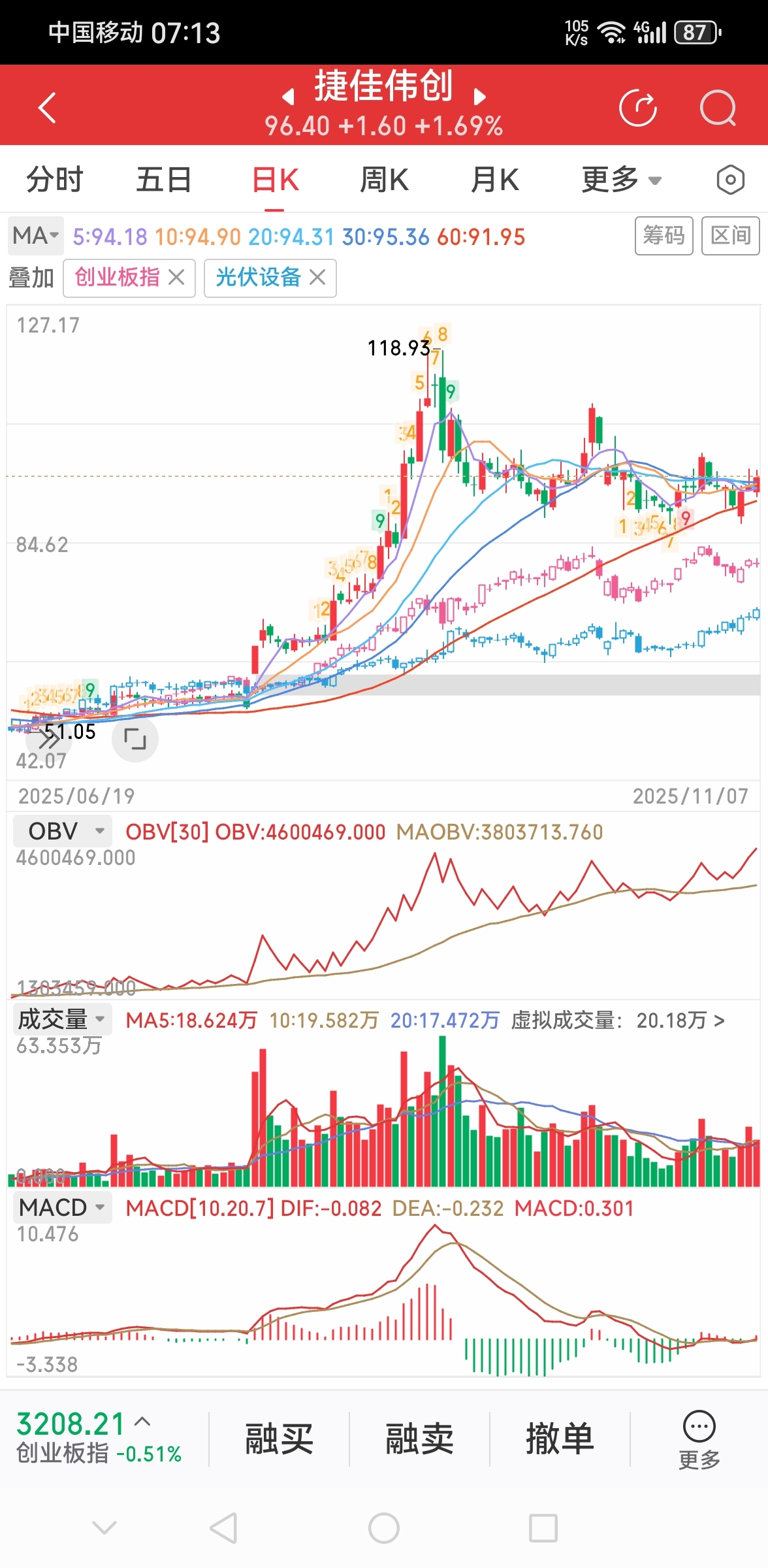 $捷佳伟创(SZ300724)$ 技术面,1.上升旗形上轨面临突破,只要站稳100元以上,2.OBV能量潮指标创历史新高,说明这段时间畜势整理,3.MACD在零轴粘连几天后上周五金叉向上并出现红柱,4.小牛市趋势可以继续,光伏类政策利好不断,综上所述,短期小目标130元左右,年㡳150元左右